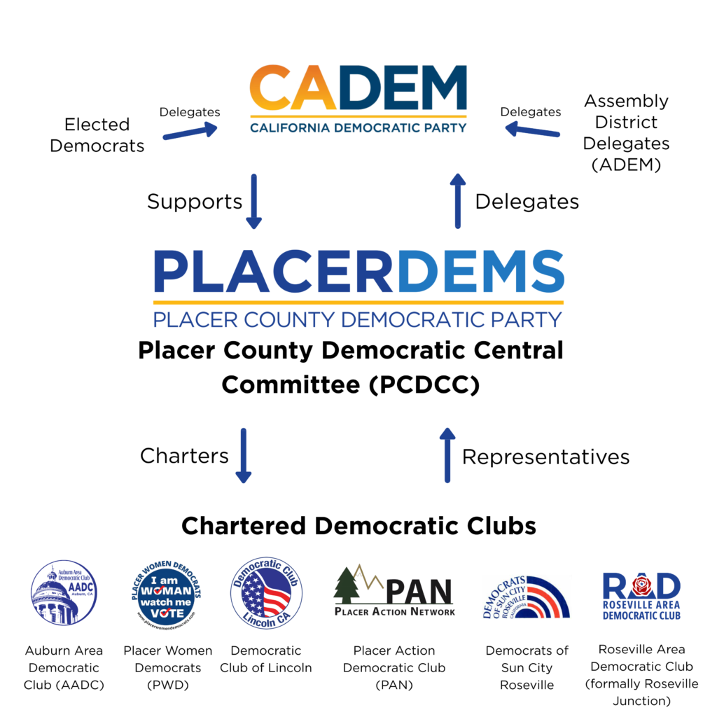 While the California Democratic Party (CADEM) manages the broad vision and statewide strategy, the Placer County Democratic Central Committee (PCDCC) and its affiliated Chartered Clubs focus on grassroots mobilization and local candidate recruitment. Together, these three tiers form a cohesive structure that connects high-level policy endorsement with direct community activism and local representation.